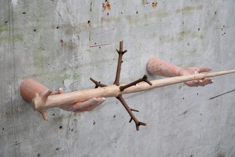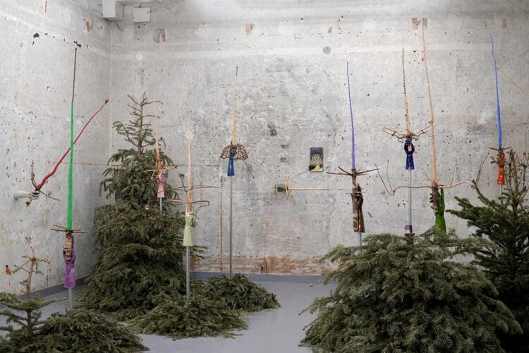 The installation at Atelier 35 proposes a display of an arrangement of fir trees recovered from the streets of Bucharest after the winter holidays, reconfiguring a forest—in this context—devoid of life, reduced to a decoration. Above the needle-tips that are about to fall, triumphs an installation made of ceramic pieces intersected with polished fir trunks, intertwined and shaped into swords that mirror the image corresponding to the Ten of Swords in Tarot – in an almost performative arrangement. The card, read with the swords down, signifies the end of a cycle, betrayal, or profound pain; while read in reverse, it can signify healing, overcoming a difficult period, and the possibility of starting a new phase. From here, the artist develops the rest of the elements that compose the ensemble.
