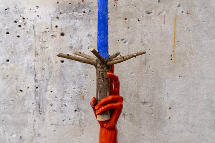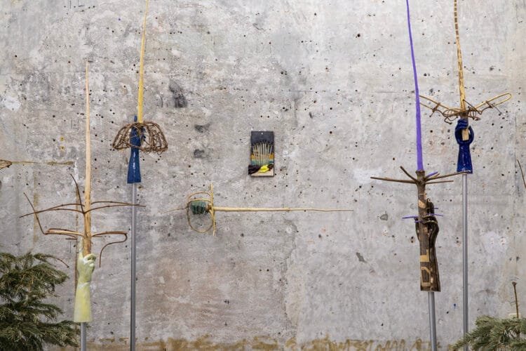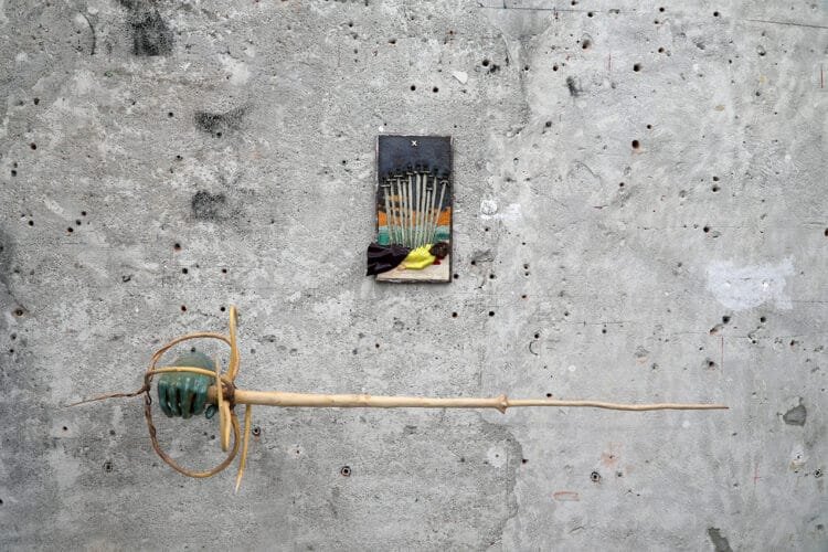 Just as the theme it investigates is anchored in modes of spontaneous exploration, the exhibition begins with an image the artist encountered during a recent journey when he noticed a fir tree decorated in the middle of summer in a village cemetery. Almost premonitory, this imprint triggered the creative process for “Ten of Swords.” Between the intuitive power of reading a landmark and its relationship to the idea of fate, lie subsequent explorations, where the symbol-image glimpsed on the move activated childhood memories and a process of investigating traditions revolving around the fir tree. In this context, the tree carries multiple meanings: from its use in funeral rituals to symbolizing life. In various forms, whether decorated, carved, configured as a toy, or a matchstick, it denotes both practical versatility and new narratives accompanying each practical aspect around which this element can transfigure.