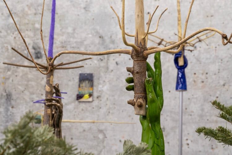 Alexandru Mihai Budeș’s artistic practice is significantly influenced by the memories that formed his early years, and the fir tree is a landmark that appears earlier in his works. Developing a series of works started in 2020, based on the nostalgia of creating an emotional bond with this residue of the winter holidays, the artist recontextualizes the trunks of the trees into swords of various shapes and sizes, initially replicating objects used in childhood games behind the block. The first series of swords, made from trunks found on the streets, explored the childhood spirit of giving a new fate to this magical waste. Later, for the exhibition at Atelier 35, the artist creates a more complex display—developing a scenography of the silent passage of time, but also an exploration of the multiple meanings a symbol can encompass.