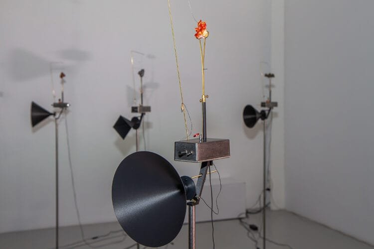 Ioana Vreme Moser’s artistic research proposes understanding the accident from two perspectives. On the one hand, tracing the history of zincite, a mineral resulting from mining accidents, she displays its material changes in successively altered mineral forms. On the other hand, or perhaps complementarily, the dissemination of distinct sounds, differentiated by human intervention, also appears accidental, given the mechanism of production—more precisely, one that is artificially composed, through the augmentation of natural matter with electrical structures, but which does not generate fixed sounds that can be manipulated like musical notes. What Ioana Vreme Moser achieves through her dual approach to accident in relation to sound is to highlight the spontaneity of the auditory dimension or, more specifically, the way in which the soundscape is continuously reconfigured in the source-receiver dyad.