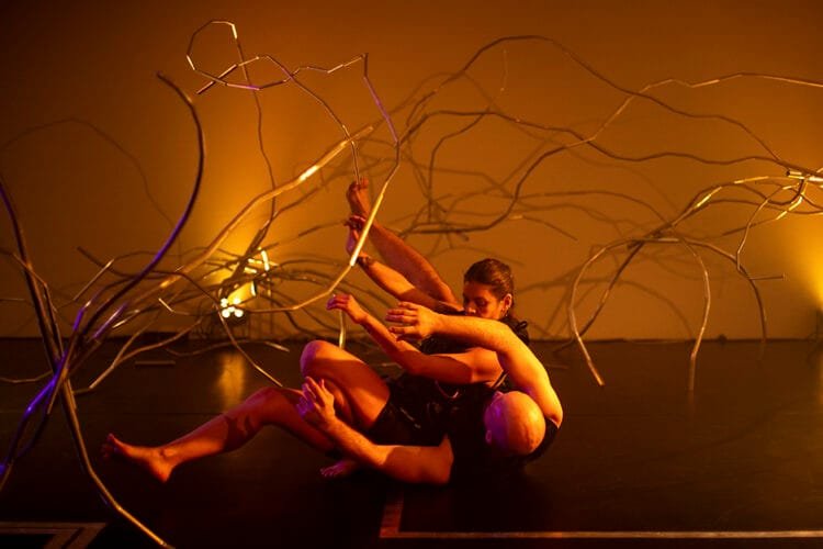 We built the choreographic language around the concept of interbeing, a concept from Buddhist thought, according to which nothing has an independent existence, separate from other entities. We approached this concept through a change of perspective and perception that allows us to understand each element as an essential and defining part of the whole. We integrated into the language of improvisation this sensitivity that perceives and generates connections between all things, a mode of expression anchored in the connection with the other, with the stage, with the music, and with the entire performance.