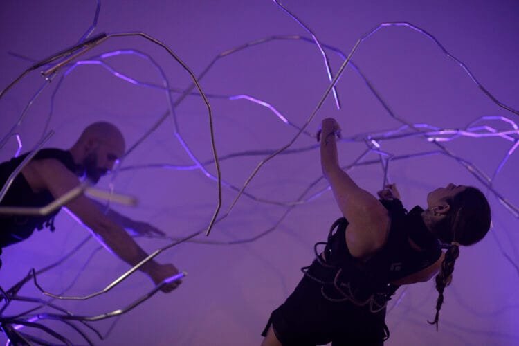 The most intense moments marked the beginning and end of rehearsals, in different ways. The beginning of a choreographic project is always charged with enthusiasm and curiosity, generated by the creative potential of the team, which begins to take different directions and give the concept the opportunity to express itself and offer meanings that do not emerge prior to working in the studio. The final rehearsal period often comes with an increased amount of responsibility, the work process becomes more meticulous, involving fine-tuning those details that make a difference in the dramaturgical structure. I think that in our project the problems arose because it is a performance that uses technology and has this complex scenic element – the installation. The technical preparations necessary for the interactive system to function took up more rehearsal time than we expected. At the same time, the challenge was to construct a dramatic structure in which the three systems – dance, sound and installation – would play an equal role on stage, to flip the dialectic where music and decor serve as elements that support dance. We wanted to suggest the possibility of a non-hierarchical macrosystem, in which man is not the central element that controls the environment, but is in turn controlled and influenced by it. This direction was a novel challenge and a major topic in building the performance.