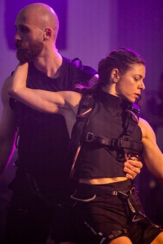 Meeting the public always has a strong effect on how you feel about the performance. Presenting the work in progress at the 20th anniversary edition of the Simultan Festival gave us the chance to test the performance and really get a feel for what worked and where we still needed to look for, change, or restructure certain details. Between this and the premiere events, we had almost two weeks, during which we worked on a new scene and the structure of the performance, rather than the choreography. We received constructive feedback from the audience, which helped us focus on the most important details and encouraged us to be confident in what we had built. We were happy to see that there were people in the audience who attended both performances in Timișoara and even the one in Bucharest. In Timișoara, we already have a loyal audience, who have attended our shows staged in recent years, and this time they were joined by people from the visual arts and experimental electronic music scenes. In Bucharest, we presented the performance at Scânteia Plus, where we had an audience specialized in choreographic art, but also a general audience, and the feedback from both sides was very welcome and constructive.