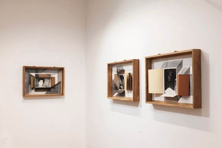 Then there is Viewfinder #29, where the 1998 photographic self-portrait seems to burst out of a dense, oppressive structure, in which the geometric charcoal drawing is encased in a massive wooden frame. Last but not least, Viewfinder #33, in which an image taken in 2017 at Cetate