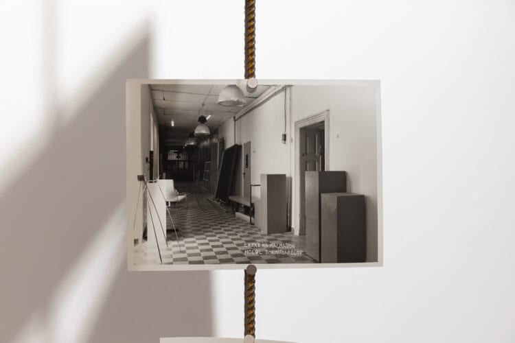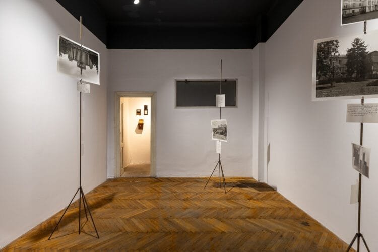To see the film, you have to explore the gallery space and reconstruct the story based on the materials presented to you: a series of analog photographs hung on various concrete frames, pages from a diary, a few banners, and a huge map of the capital from the 1930s hanging on the wall. A graduate of the UNArte master’s program in photography and video, Dragne presents himself as the curator of photographs found in the room of his neighbor, a certain Victor K. According to the meta-narrative, he organizes and contextualizes this archive.