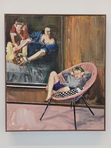 The painting inside Bercea’s work is reminiscent of Dutch Baroque painting, illustrating the daily life of people. On a contemporary-designed chair, a boy lies stretched out, his hands clasped to his ears. His relaxed position is in contrast to the painting behind him. The twilight of a myth may suggest the child’s choice not to listen to the story behind the myth – a story that belongs to a distant past, reflecting the desire to believe only in what can be seen and the desire to detach oneself from the past. Thus, Bercea’s painting marks a clear separation between subjects: the two women-the painting that symbolizes the past, and the child-the real-contemporary character.