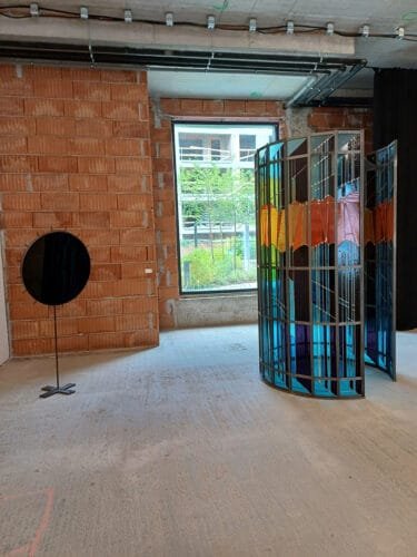 The exhibition extends across three exhibition halls, part of a residential complex. It is an industrial setting, seemingly unfinished, reminiscent of messiness. It is not a “white cube,” where harmony is created and the works have their own niche, but rather a setting that pushes the viewer to explore every corner and decipher the art that awakens a feeling in them.