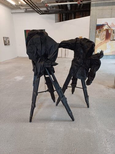 The exhibition continues with the installation Trinity, Triangle, Trio No. 2 by the Apparatus 22 group. The materials used – transformed vintage black leather jackets, oil paint, acrylic paint, and three vintage tripods – outline a conceptual scenario in which human presence is subtly but powerfully suggested. The jackets evoke the silhouette of the artist, a memory of the absent body, while the paints refer directly to the artistic gesture, to the traces of the creative hand. The tripods, technical objects loaded with visual memory, are reminiscent of the documentation process.