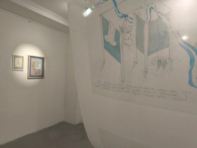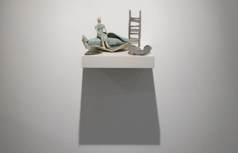 In general, it feels very much, that the exhibition is a patchwork quilt of memories and quoted objects it is as much assembled as it is created, there are these lovely delicate things, be they ceramic sculptures or charming watercolors that are softly sprinkled throughout. The space we navigate feels like a library of memories, where each object or construction serves as an entry point into a specific moment, a specific experience.