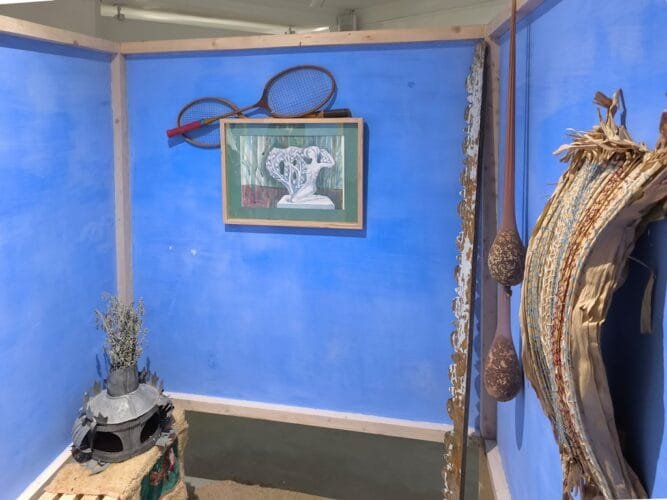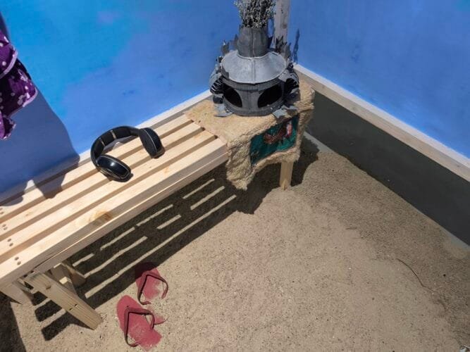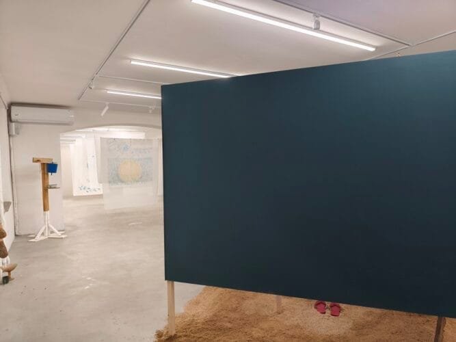 Somewhat further down the line, we have to make a stop, we are entering the changing booth, plopped neatly onto an island of sand, a sort of a sanctuary, a carefully decorated square box as if plucked from an urban lake beach. Upon entering the booth, we lose sight of the rest of the exhibition, and by limiting our view of surroundings we are offered an immersion into the association to the actual place where a booth like this would belong. It is as though we need to isolate ourselves into this small excerpt to be able to have before us its place of reference.