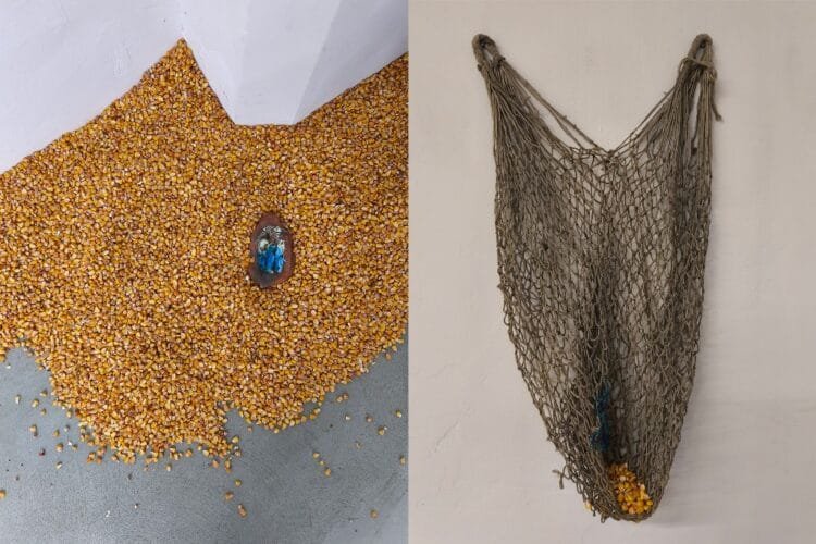 The artist is a collector of objects consolidated or plucked out of their surroundings as they are, objects that accentuate the almost incidental nature of what becomes emblematic and what gets lifted into the rank of “traditional”, or “authentic” and the journey it generally makes to achieve said status. It is both a recollection and an investigation. Is what culturally authentic, naturally autochthonous? Corn travelled across the ocean to become such an indispensable part of our diet and to find its yellow hue, most emblematic for our lands.