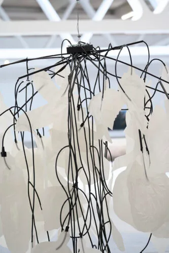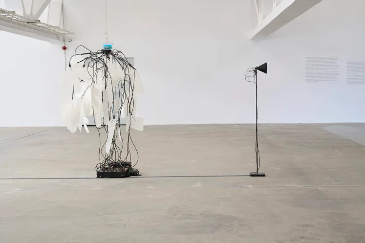 The discourse on the fragility of life and the impossibility of reducing it to an equation is taken up by Floriama Cândea’s installation, Neural Bloom #2 – My Breath is Someone Else’s Air (2025), a rhizome-flower with countless stems, a white bird with a hundred arms, a hybrid being that uses technology to help humans relearn how to look at raw, elemental nature. Leaving behind any scala naturae, together with the principle of verticality and the rigid dichotomies mind-body and artificial-natural, the relation is articulated through similarity and difference, calling for a slow movement of regression toward that arche, the originary point of the world that makes possible any becoming-plant and becoming-animal.