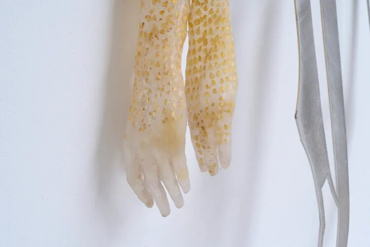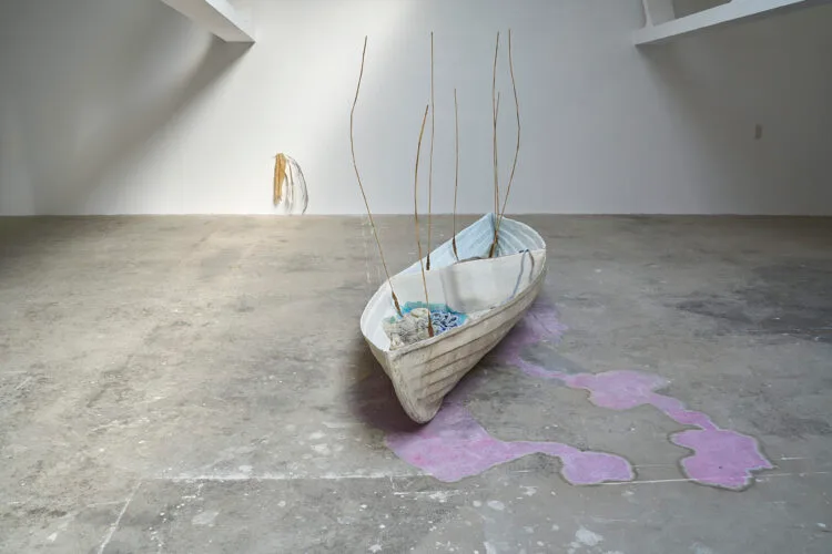 Along the same affective-visceral line are the works, both Dionysian and Apollonian, in the SEAXBURH (2025) project of British artist Miriam Austin. A beached boat, at the bottom of which lie two figures in silicone mixed with minerals collected from marshlands along the rivers Po (Italy) and Great Ouse (England), is thus joined by a series of objects that combine sharp metal pieces with organic materials and diaphanous garments. Complementing these, a video reimagines the legend of Saint Æthelthryth, a mythic Anglo-Saxon figure whose body is said to have been miraculously preserved in the swamps of eastern England, setting it in parallel with the fate of the eel, a species on the brink of extinction, once so numerous as to shape the economic life and beliefs of communities.