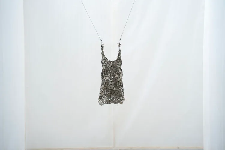 To this end, we can decipher the delicate presence of Lera Kelemen’s works in the exhibition: a cocktail dress composed of metal watch cases (only so much adrift to brace my self control, 2025), a sword inlaid with crystals extracted, likewise, from watches (an object sits on your table, waiting to be picked up, 2025), a sinusoidal wave of crystal glasses that bear traces of lipstick and drinks, encapsulating dilated moments of exhilaration and affective intensity, irretrievably lost (bracelet, 2025). Time, death, and memory are approached here with lucid melancholy, from the perspective of archiving, of the artist as a collector of objects, memories, moments. The longing to archive is thus connected, following Derrida’s suggestion in Mal d’archive: Une impression freudienne, with the anxiety of death. The watches, as well as the Dionysian moments sealed in transparent glasses, recall that the archive is at once eros – the desire to preserve–, and thanatos, a species of death, a strategy for fixing the living in a static form, a way of freezing memories, of transforming experiences into documents.