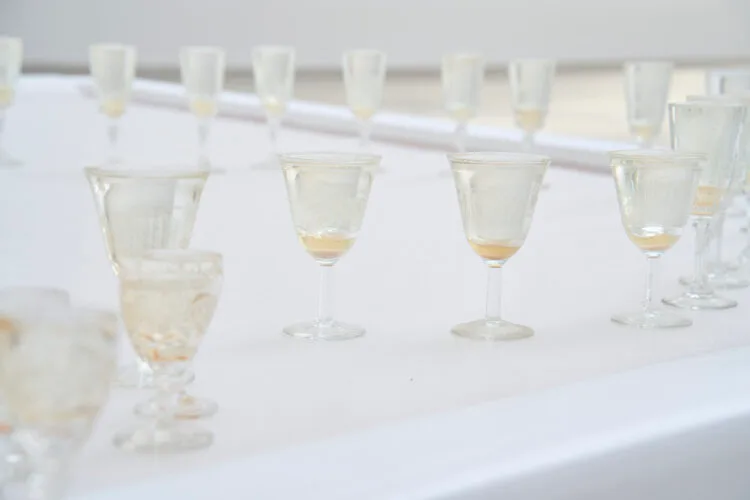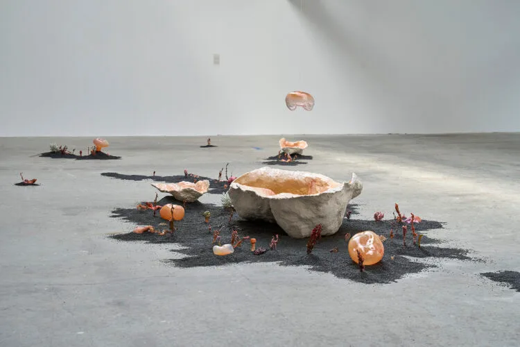 The second installation, a glade with algae and mushrooms made of resin, clay, and glass, takes on the role of activating the body. Placed low, at ground level, it operates gesturally, inviting each viewer to bend down, to transpose themselves to the height of the mushrooms, to become-fungus, and to experience how they look at the sky. The scenario is, once again, uncanny: a world inundated with water, at the threshold between extinction and renewal, where Astrida Neimanis’s hydrofeminist phenomenology operates. All living beings are aquatic bodies. Our body is composed of water, and water circulates and connects us with other bodies, species, ecosystems, with the elements and with nature itself (Bodies of Water: Posthuman Feminist Phenomenology, 2017).