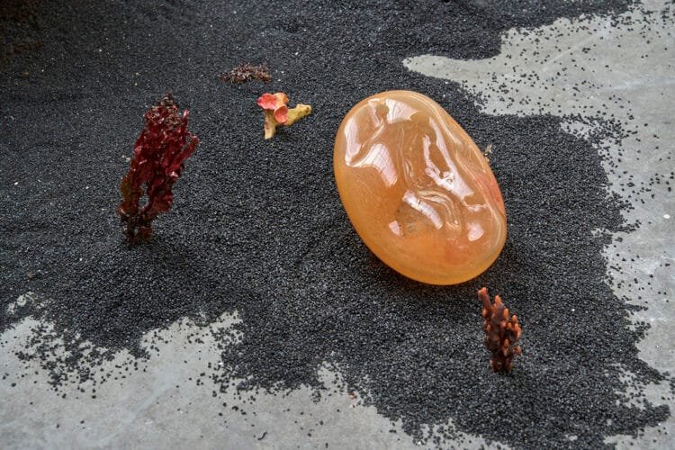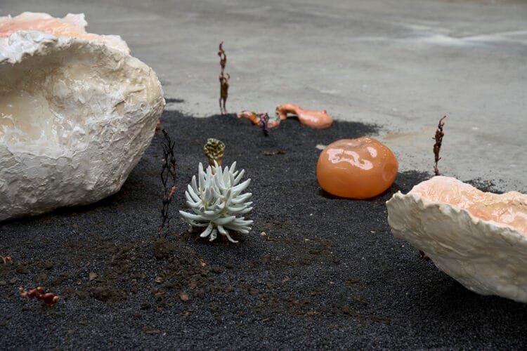 The second installation, a glade with algae and mushrooms made of resin, clay, and glass, takes on the role of activating the body. Placed low, at ground level, it operates gesturally, inviting each viewer to bend down, to transpose themselves to the height of the mushrooms, to become-fungus, and to experience how they look at the sky. The scenario is, once again, uncanny: a world inundated with water, at the threshold between extinction and renewal, where Astrida Neimanis’s hydrofeminist phenomenology operates. All living beings are aquatic bodies. Our body is composed of water, and water circulates and connects us with other bodies, species, ecosystems, with the elements and with nature itself (Bodies of Water: Posthuman Feminist Phenomenology, 2017).