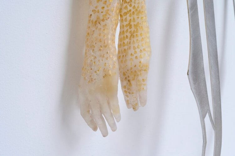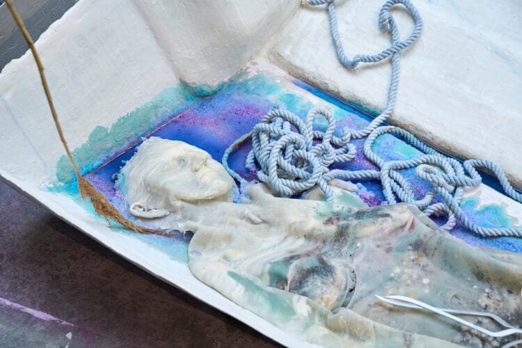 Along the same affective-visceral line are the works, both Dionysian and Apollonian, in the SEAXBURH (2025) project of British artist Miriam Austin. A beached boat, at the bottom of which lie two figures in silicone mixed with minerals collected from marshlands along the rivers Po (Italy) and Great Ouse (England), is thus joined by a series of objects that combine sharp metal pieces with organic materials and diaphanous garments. Complementing these, a video reimagines the legend of Saint Æthelthryth, a mythic Anglo-Saxon figure whose body is said to have been miraculously preserved in the swamps of eastern England, setting it in parallel with the fate of the eel, a species on the brink of extinction, once so numerous as to shape the economic life and beliefs of communities.