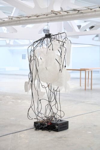 The discourse on the fragility of life and the impossibility of reducing it to an equation is taken up by Floriama Cândea’s installation, Neural Bloom #2 – My Breath is Someone Else’s Air (2025), a rhizome-flower with countless stems, a white bird with a hundred arms, a hybrid being that uses technology to help humans relearn how to look at raw, elemental nature. Leaving behind any scala naturae, together with the principle of verticality and the rigid dichotomies mind-body and artificial-natural, the relation is articulated through similarity and difference, calling for a slow movement of regression toward that arche, the originary point of the world that makes possible any becoming-plant and becoming-animal.