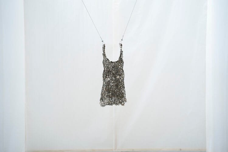 To this end, we can decipher the delicate presence of Lera Kelemen’s works in the exhibition: a cocktail dress composed of metal watch cases (only so much adrift to brace my self control, 2025), a sword inlaid with crystals extracted, likewise, from watches (an object sits on your table, waiting to be picked up, 2025), a sinusoidal wave of crystal glasses that bear traces of lipstick and drinks, encapsulating dilated moments of exhilaration and affective intensity, irretrievably lost (bracelet, 2025). Time, death, and memory are approached here with lucid melancholy, from the perspective of archiving, of the artist as a collector of objects, memories, moments. The longing to archive is thus connected, following Derrida’s suggestion in Mal d’archive: Une impression freudienne, with the anxiety of death. The watches, as well as the Dionysian moments sealed in transparent glasses, recall that the archive is at once eros – the desire to preserve–, and thanatos, a species of death, a strategy for fixing the living in a static form, a way of freezing memories, of transforming experiences into documents.