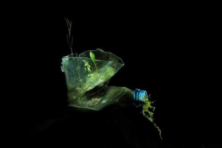 In the Kunsthalle Bega exhibition, a distinctive place is held by plants photographed in the midst of a struggle to survive inside transparent plastic casings. Against a dark background, their vivid green shines triumphantly, illuminating the composition suspended in a void that philosophers would associate with that dense “nothing”, with Being itself. Their uncanny beauty, which fuses fragility and force, evokes the way Schopenhauer defined the vegetal realm as the purest embodiment of the “will to live”.