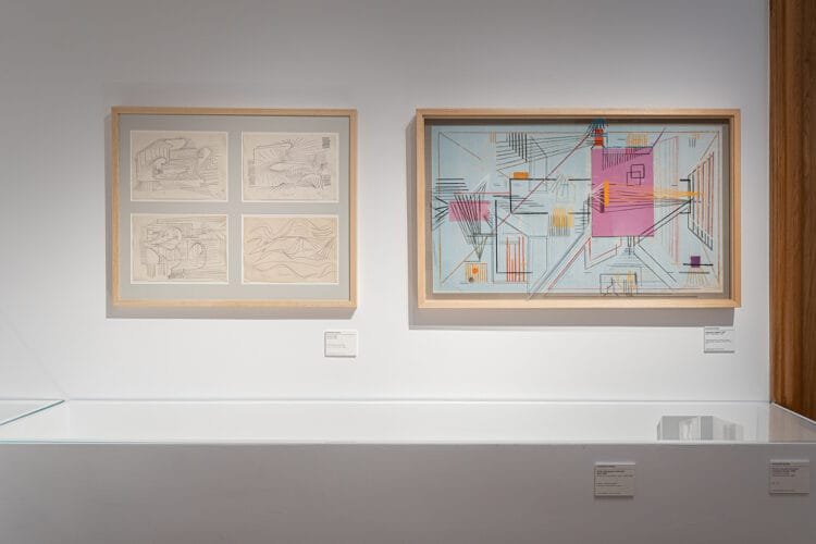 In the second room, we find cabinets dedicated to preparatory sketches of other works in the exhibition and pages from sketchbooks, alongside a photograph of each artist and a work by Flondor (Space Organization, 1967) playing with the superimposition of glass and paper, reminiscent of Duchamp’s La mariée mise à nu par ses célibataires, même.