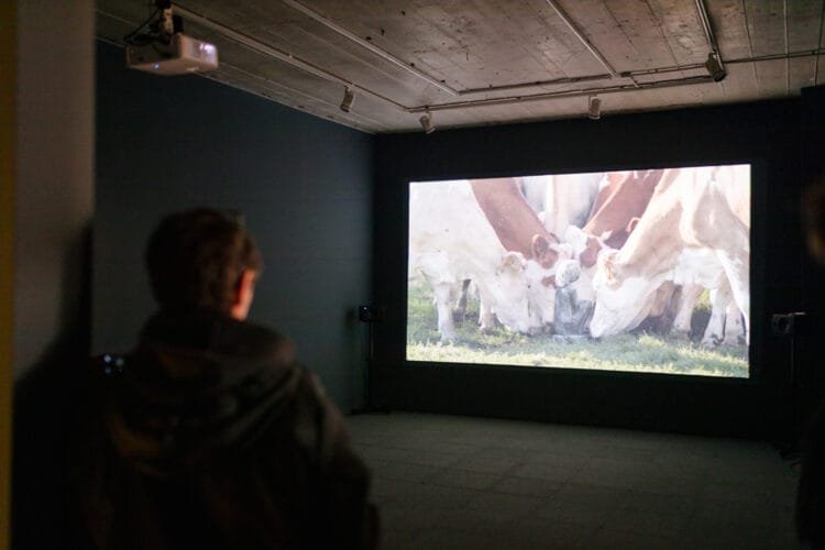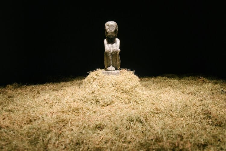 And in the video installation UnWorlding, the dialogue between past and present is once again present, through the use of a renowned work of art in an artistic project. This approach reminded me of Pierre Huyghe’s use, in 2011, of a copy of Constantin Brancuși’s Sleeping Muse, alongside a live crustacean, coexisting in an aquarium in the installation Zoodram 4 (in the retrospective exhibition at the Centre Pompidou), and perhaps the similarities are not a mere coincidence, but a conscious continuation of certain ideas. In this case, we are also dealing with a copy of a work by Brâncuși – Cumințenia Pământului (1907), only that it is made of salt and placed in a field where it can freely interact with animals, in a setting different from that of a museum (it is an escape from the museum). In addition, it seems to visually echo archaic figurines, which themselves once referred to a different relationship with nature. The way in which they come together can reveal the indistinctness between different forms of existence and between art and life in more distant times.