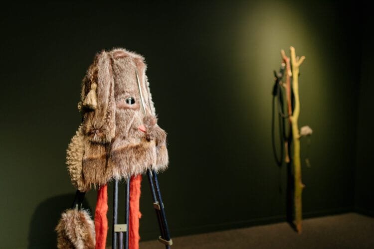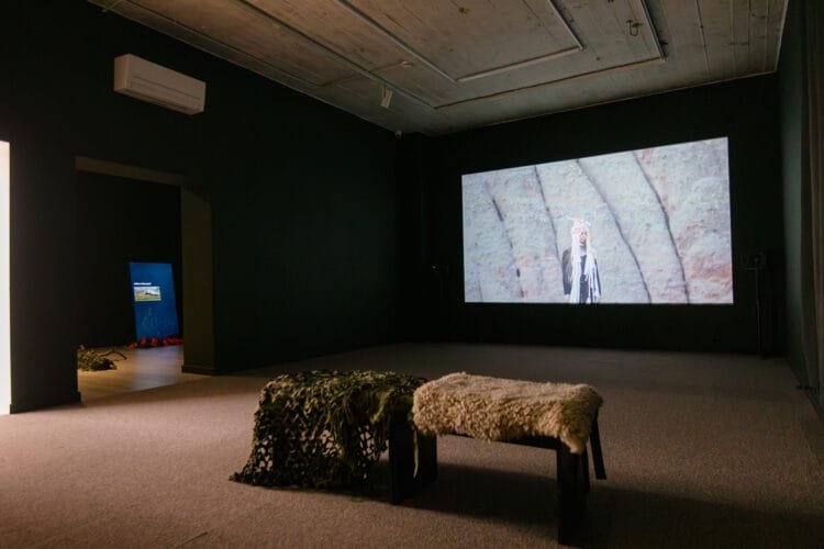 The implications of the nature-culture relationship are addressed on several levels, through a whole network of cultural references, but it is impossible not to refer here to Nicolas Bourriaud’s ideas about excavating the past or moving backwards. This can be glimpsed in the two-channel video installation Exercises for Peace (2023), which revisits a moment in the past that reminds us of attitudes that can sometimes change the course of history, such as courage, reaction, and non-violent resistance, introduced through the story of the woman who managed to drive away the Ottomans, dressed as a fearsome creature (a Transylvanian legend celebrated in spring during the Lolelor Carnival).