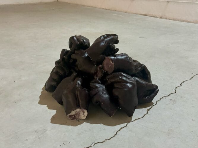 The roots of the works are casts of the artist’s hands – fingers, joined in what could be a sign of the cross, each holding a subtle hook. The difference in height between the casts not only energizes the entire exhibition, but also successfully establishes the convention of axis mundi, making partially visible a realm strongly connected to the present plane. The apex of the pyramid traced by the works is doubled by a heap of similar casts. “YGGDRASILL” thus confronts the viewer with a complex semiotic landscape that can be interpreted in various more or less optimistic keys. The artistic research undertaken by Mircea Modreanu offers points of reference for decoding without being reduced to an ethnographic study. Called by curator Călina Coman, in the context of the exhibition “Despre sine, cruci și altele”, Modreanu puts on this garb once again, decomposes and recomposes in front of the audience precisely the idea of identity. The creator is simultaneously present and absent – the artist’s hands orchestrate the entire ensemble of works, partly assuming the function of the tree of life. The heap of hands evokes both the creative gestures and the collective efforts that build the history of a community. The boundaries of history and identity are questioned and neutralized, becoming fluid. The trans-geographical space mapped out by Modreanu becomes a terrain for re-evaluating personal identity, contemplating origins and rewriting identity myths. The choice to use precisely one of the casts for the exhibition poster is therefore no coincidence, emphasizing rather the narratives behind the vestiges, the actual lives of the members of a community and the invisible forces that unite them.