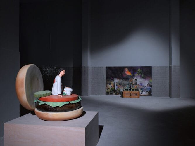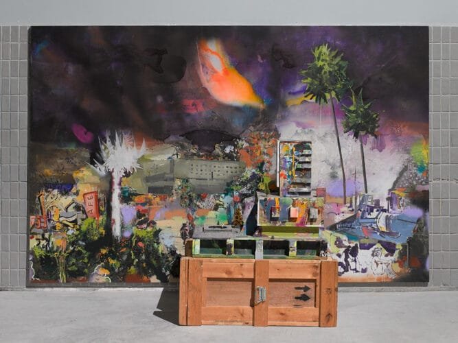 All this auctorial plasticity referential to his own work and his own life—plasticity understood as the attribute of an initial substance to perpetually transform itself on contact with the environment, taking over but also remaining there, to the detriment of its sister, the elasticity, which only shows that a substance always returns to its initial form—also outlines the fresh approach of these diorama-scenographic installations which are three-dimensional renderings of paintings. The work that gives the exhibition its title, New Tenant, Sunshine Noir, is a 3D recreation of the painting Offspring of Neptune (2023), while Classic Aroma Stabilizer (2017) is the painting that forms the basis of the second installation—the one mentioned earlier with the open refrigerator door. While the first is clearly labeled as an installation in the exhibition layout, the second is catalogued as a lightbox. It is also a reference to the box with unidirectional lightning used by Baroque painters and, much later, by Corneliu Baba, a Romanian artist whom Bercea actually collects.