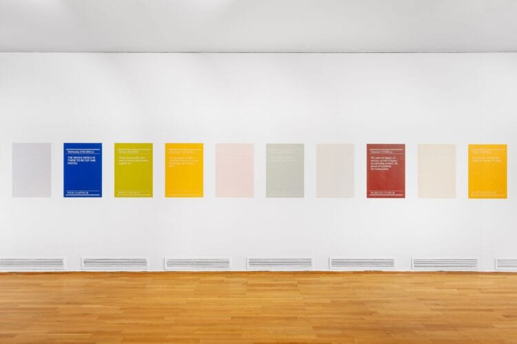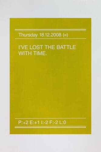 Cunoșteam o mare parte din lucrările Ioanei Nemeș dinainte să ajung la expoziția de la MNAC, unde eram curioasă mai degrabă de felul în care acestea au fost plasate într-un context mai larg al intereselor sale adiacente legate de sport, modă, entertainment, teorie. Eram pregătită să descopăr poate unele lucrări mai puțin circulate, și poate mai mult din culisele producției sale artistice abundente. Sau cel puțin așa credeam. Marea surpriză a venit însă de la lucrările pe care le cunoșteam cel mai bine din practica ei, Monthly Evaluations (2004-2010), cu subseriile sale, Time Exposure, Vanishing Point, Travel și eponimul Monthly Evaluations marcat cu o dată anume. Văzute împreună, într-un număr și la scară atât de mare, lucrările din această serie, vizitate într-o perioadă în care reciteam pe sărite din propriul jurnal, m-au dus la o nouă percepție a însăși ideii de timp.