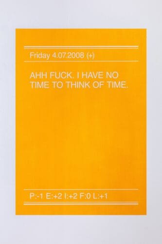 Dacă lucrările Ioanei Nemeș distilau experiența într-o structură vizibilă și publică, jurnalul meu o lasă brută și privată, îngropată în aglomerația digitală cu care mă voi lupta probabil pentru restul vieții. Metoda ei produce un sentiment de control, de timp prins în loc printr-un sistem precis; a mea refuză controlul, acumulându-se fără principiu organizatoric, un haos în care mă aflu continuu fără să-l pot cuprinde pe deplin.