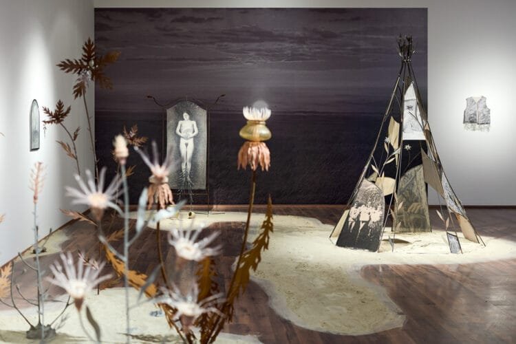 În cadrul aceleiași secțiuni, Miraj lui Kortmann-Járay Katalin și Mendreczky Karina ne arată frontierele fragile dintre mit, memorie ecologică și culturală și materialitate, în timp ce pune în temă intersecția dintre istoria naturală și cea umană. Instalația lor îmbină personaje agrare precum ciobanii, rusaliile și lanurile de grâu cu o floră și o faună fictive, toate acoperite de nisipuri mișcătoare, imitând căldura și mirajele strălucitoare din Hortobágy. Nisipul, în continuă mișcare, surprinde natura memoriei și modul în care însuși peisajele par să se dizolve și să se reformeze în urma intervenției umane. În același timp, dimensiunea instalației, care amintește, de asemenea, de imensitatea parcului Hortobágy, ocupă o porțiune poate disproporționat de mare din spațiul expozițional, perturbând oarecum fluxul general al narațiunii conceptuale a expoziției, în ciuda faptului că priveliștea în sine este ca întotdeauna captivantă. Pentru mine, într-un fel, Miraj reflectă spațiile liminare în care mediile naturale se întâlnesc cu percepția umană, subliniind modul în care peisajele sunt deopotrivă modelate și oglindesc poveștile pe care le atribuim acestora.