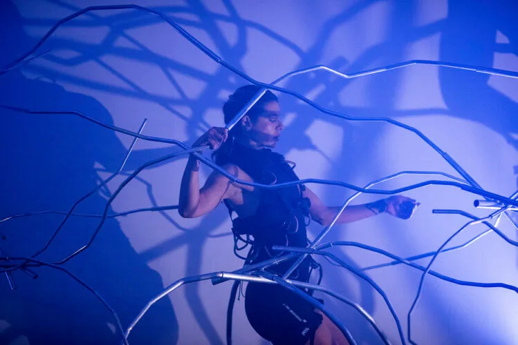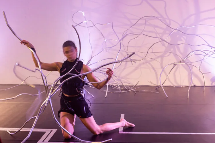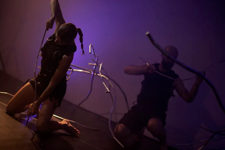 Cea mai mare necunoscută în tot procesul a fost instalația metalică modulară creată de Nimbert Ambrus. Spun necunoscută deoarece e prima dată când am lucrat cu un element scenografic atât de complex. Instalația a avut o prezență puternică în spațiu, ceea ce a transformat-o în elementul central al performance-ului. Astfel, aceasta a devenit materialitatea conceptului: o structură interconectată, modulară, flexibilă, imprevizibilă, mobilă, care preia și rezonează impulsuri, receptivă la schimbare, un mediu misterios și viu.