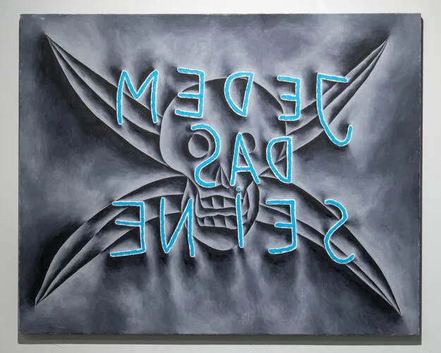 Mihnea Mircan vorbește în textul lui curatorial despre raportul dintre figură și fundal prin prisma unei simultaneități diagramatice și despre o altă axă importantă a expoziției, cea a vizualizării textului, transpus astfel într-un motiv multistratificat. Rolul textului în pictura lui Gili susține o alianță temporară a cuvintelor într-o înlănțuire vizibilă, prezentă ca un monolit aproape, revendicând familia de cuvinte și de concepte din care sunt extrase cele câteva, capabile să susțină un „frontispiciu” în oglindă. Textul nu pare scris, ci mai degrabă săpat, corodat în timp, nu are fluiditate, ci încrâncenarea cu care mâna stângă preia controlul și încearcă să traseze un alt parcurs, imprevizibil și lipsit de măiestrie. Oglindirea textului are poate cel mai percutant impact în lucrarea JDS, 2011, unde „Jedem das Seine” (fiecăruia ce este al său), inscripția de fier de pe poarta lagărului de concentrare de la Buchenwald, este privit din perspectiva călăului, a celui căruia nu i se adresează, de fapt, acest mesaj; a celui care nu „merită” să sufere, să moară sau să se afle „pe partea cealaltă”. Privitorul este iarăși supus să se privească pe el însuși privind, să se surprindă în exteriorul funiei răsucite, întrebându-se cum se poate ocoli totuși gardul acesta de fier și străpunge oblic o istorie a învingătorilor și a învinșilor.
