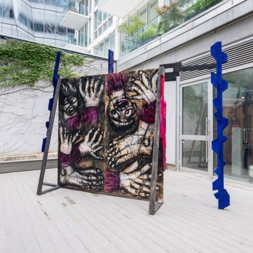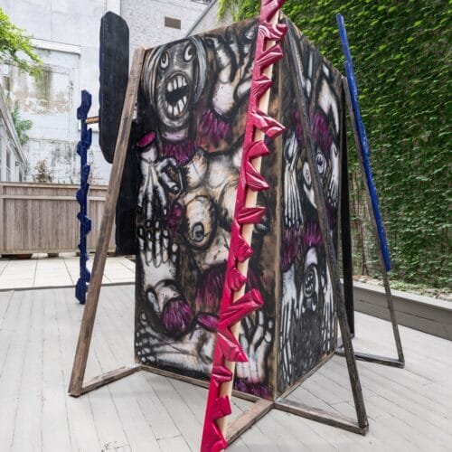Curtea SLAG&RX devine un spațiu de trecere în expoziția de sculptură în aer liber „Inhabitance” a lui Dumitru Gorzo. Pe West 19th Street, artistul român a asamblat o pădure de forme sculptate în lemn care fac referire la convenții antice și la practica sculpturală contemporană. Instalația funcționează ca un fel de sinteză sau, așa cum o numește artistul, un hibrid între lemn și carte, oferind un peisaj în care spectatorii se mișcă între narațiuni concurente ale memoriei și prezenței materiale.