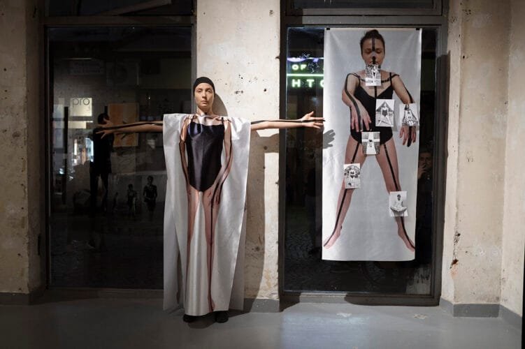WANDA MIHULEAC. Revizitează o acțiune realizată împreună cu coregrafa Liliana Iorgulescu în 1978 cu intenția de a folosi corpul ca instrument de resemnificare. Prin intermediul unui performance, amintirea preia dimensiunea prezentului și procesul de rememorare devine o senzație corporală simțită colectiv. Fotografiile-document din anii ’70 sunt podoabele unui costum actual care după consumarea performance-ului se transformă în mărturie materială. Performance-ul gândit de Wanda Mihuleac din seara vernisajului a introdus miza întregului demers al proiectului: transferul intergenerațional al memoriei, unde lucrările celei de-a doua situații sunt purtătoare mobile de semnificații și afecte.
