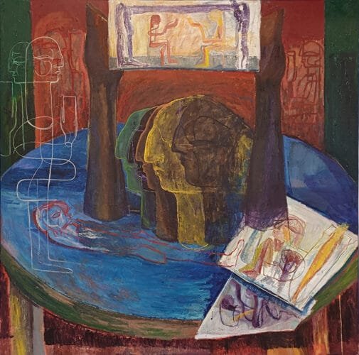 Fizionomia abstractă apare ca un laitmotiv în această operă: chipurile antice trasează o direcție clară către mistic și oniric. Cele cinci măști dispuse vertical pe masă își găsesc oglindirea într-o formă contemporană care susține două capete – o dublă personalitate care trăiește atât în real, cât și în imaginar.
