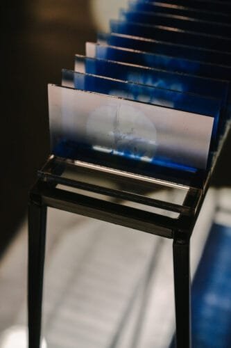Pe de altă parte, în The Blue Room, remedierea a mers înspre altă direcție – aici, mediul digital este translatat înapoi, către originile fotografiei, prin cianotipie pe sticlă. Această mișcare nu este doar tehnică, ci declarativă: imaginea digitală este obiectivizată, devenită tangibilă, pentru asumarea unei manifestări a remedierii care mi se pare foarte importantă: hipermedialitatea, un concept esențial în teoria media, de asumare a mediului în sine, a interfeței. Am vrut să atrag atenția asupra prezenței palpabile a mediului, invitând publicul să experimenteze nu doar conținutul, ci și mediul în sine, care e parte integrantă și asumată din sistem.