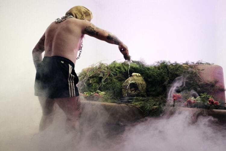 Urmărindu-l de la etajul de jos, privind ecranul, doar auzind din afara spațiului și completând restul în imaginație, sau simțind în întregime intensitatea de la etaj, performance-ul lui Sasha Bandi reia un impuls primordial. El nu ezită să-l exprime cu voce tare, la propriu, manifestând o râvnire autentică, un afect perturbator față de limitările condiției umane și imposibilitatea de a le depăși. Din dorința de a soluționa sau domestici o anume gravitate a existenței ia naștere un ritual crud, inconfortabil. Trupul, transpus într-o stare de dezbrăcare, devine punte conflictuală între instinct primar și constrângerile impuse de structuri socio-morale. Ritualul se coregrafiază ca o reacție de supraviețuire, repetitivă și dură, apropiată de un proces de exorcizare. Corpul devine vehiculul unui vector inefabil, extins dincolo de ceea ce raționalitatea reușește sau este obișnuită să perceapă, pregătit să livreze ceva ancestral și inaccesibil altfel. Performance-ul operează la nivelul extremelor, printr-o fuziune a tuturor elementelor constitutive, generatoare de intensitate și, totuși, vulnerabilitate.