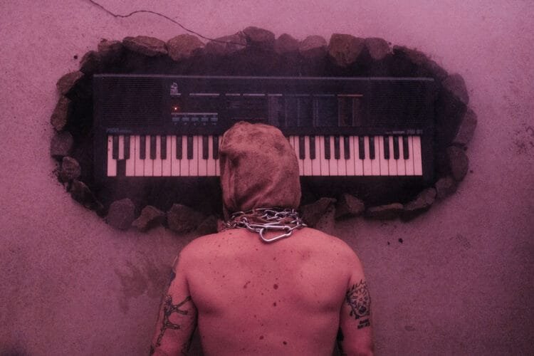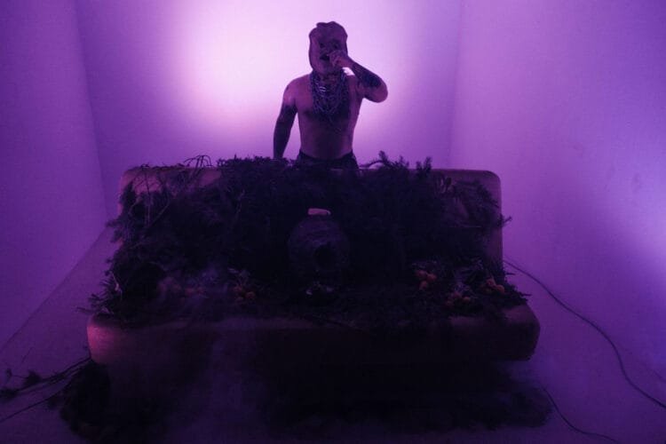 Spațiul expozițional devine un loc de căutare a unui adăpost spiritual, paradoxal atât refugiu personal, cât și un cadru care demitizează soluționarea provocărilor existențiale. În această transă, Sasha Bandi pendulează între o poziție ușor moralistă și o dezgolire emoțională – unde renunțarea la sine devine inevitabilă, chiar necesară. Clădind un cadru fonic strident, acest ritm compulsiv se desfășoară într-un univers scenografic impregnat de referințe din cultura păgână europeană, mitologice și de repere personale reinterpretate. Cuțitul, pianul, carnea, canapeaua și lumina violet punctează această narațiune care coagulează adaptarea, provocările existențiale, instincte și supraviețuirea în timp ce dă naștere unui alter-ego mascat, transfigurat, pregătit să elibereze un cumul afectiv. Actul său capătă dimensiunea unui sacrificiu, o perpetuă disoluție în care sacrul și profanul își pierd relevanța, iar singura posibilitate rămasă este aceea a unei distrugeri catartice, în imediat. „TROGLODYTE” ne-a scos din zona de confort și, inevitabil, ne-a determinat să ne întrebăm ce urmează (și când).
