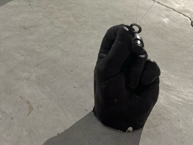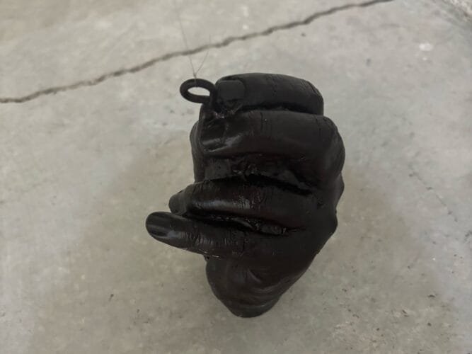Rădăcinile lucrărilor sunt mulaje ale mâinilor artistului – degetele, unite în ceea ce ar putea fi un semn al cruci, ținând fiecare câte un cârlig discret. Diferența de înălțime dintre mulaje nu doar că dinamizează întreaga expoziție, dar stabilește cu succes convenția de axis mundi, făcând parțial vizibil un tărâm de dincolo puternic connectat cu planul prezent. Vârful piramidei trasate de lucrări este dublat de un morman de mulaje similare. „YGGDRASILL” pune deci privitorul în fața unui peisaj semiotic complex, care poate fi interpretat în diverse chei, mai mult sau mai puțin optimiste. Cercetarea artistică întreprinsă de Mircea Modreanu oferă repere de decodare fără a se reduce la un studiu etnografic. Numit de curatorul Călina Coman, în contextul expoziției „Despre sine, cruci și altele”, alchimist deghizat, Modreanu îmbracă din nou această haină, descompune și recompune în fața audienței tocmai ideea de identitate. Creatorul este simultan prezent și absent – mâinile artistului orchestrează de-a dreptul întregul ansamblu de lucrări, asumându-și parțial funcția arborelui vieții. Mormanul de mâini evocă atât gesturile creatoare, cât și eforturile colective care clădesc istoria unei comunități. Limitele istoriei și ale identității sunt puse sub semnul întrebării și neutralizate, devenind fluide. Spațiul transgeografic trasat de Modreanu devine un teren de reevaluare a identității personale, de contemplare a originilor și de rescriere a miturilor identitare. Nu este deci întâmplătoarea nici alegerea de a folosi tocmai unul dintre mulaje pentru afișul expoziției, punând mai degrabă accentul pe narațiunile din spatele vestigiilor, pe viețile efective ale membrilor unei comunități și forțele invizibile care le unesc.
