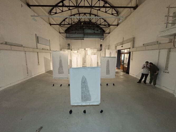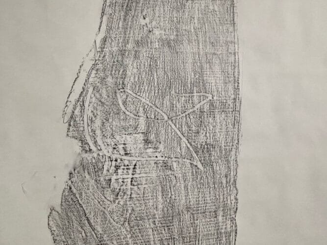 Practic, artistul revizitează lucracrea omonimă care traversa de-a dreptul expoziția „Despre sine, cruci și altele”. Grinzile de lemn gravate, atunci dispuse sub forma unei poteci meandrice”, sunt supuse la rândul lor tehnicii frotajului, generând noi obiecte. Schimbarea registrului este ușor sesizabilă – în timp ce „Despre sine, cruci și altele” și „Măști de pițărăi fac apel la obiecte, tradiții și experiențe reale, „YGGDRASILL” marchează trecerea către un alt tărâm, transnațional, transistoric și profund personal. Fiecare grindă poartă însemnul unei rune contemporane, un alfabet original creat de artist „în colaborare” cu fibra lemnoasă. Grinzile sunt frotate pe fâșii înalte de hârtie, dispuse vertical în expoziție, păstrând caracterul monumentelor documentate în etape precedente – troițe, pietre de hotar, cruci. În ansamblu, lucrările formează o piramidă, un arbore genealogic al spiritelor lemnului, fiecare cu propriul nume, scos la iveală de artist. Toate aceste detalii sugerează implicit terenul ritualic al cimitirului și, totodată, reafirmă documentarea extensivă a riturilor de trecere întreprinsă de artist în prealabil. Mircea Modreanu extinde punți culturale observate anterior și și le însușește, generând un univers uncanny, profund familiar dar complet original.